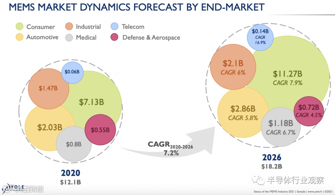 据Yole的预计,2020-2026年MEMS终端市场将以7.2%的年复合增长率增长。其中,消费领域是最大的MEMS应用市场,约占全球 MEMS 收入的 60%,到2026年约有112.7亿美元的市场。其次是汽车,汽车对MEMS的需求将从2020年的20.3亿美元上升到28.6亿美元。剩下的应用市场还有工业领域、医疗、电信、国防与航空航天等。