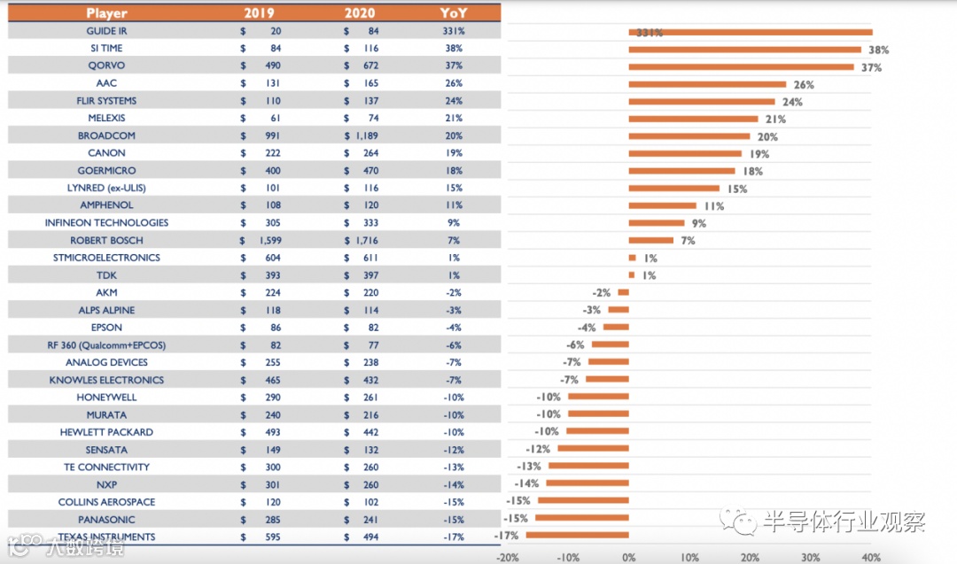 ●去年,相关公司预防冠状病毒疫情的技术有了大幅度成长,如热成像和传感或压力传感器。例如销售微辐射热测定仪的Guide IR(高德红外)、FLIR Systems和Lynrde,卖热电堆的Melexis也从中获益。与此同时,因对体温升高相关量测应用需求增加,Amphenol的压力MEMS因呼吸机和持续正压(CPAP)机器等呼吸系统需求而增长。