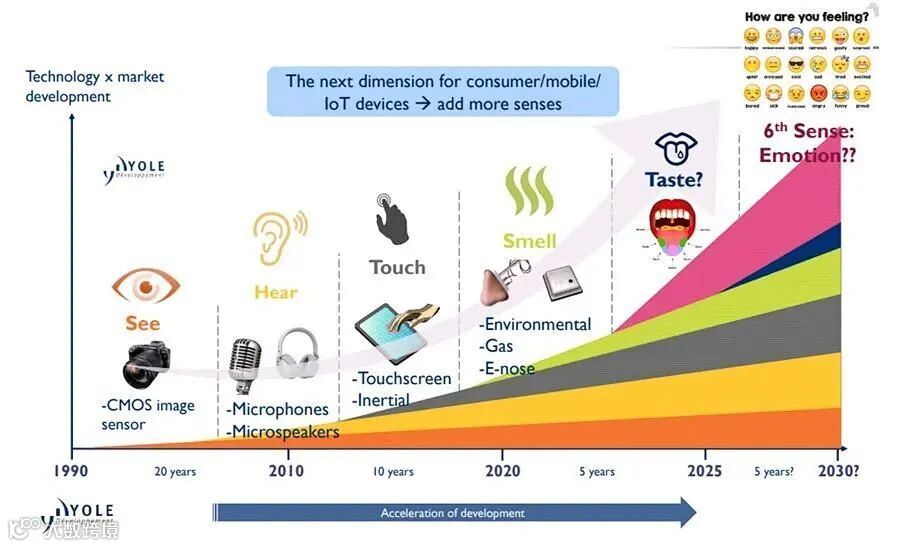 从几十年前的第一个图像传感器到现在的气体传感器,传感器的能力不断发展。情绪感知已经出现了,我们还没有看到味觉传感器。
