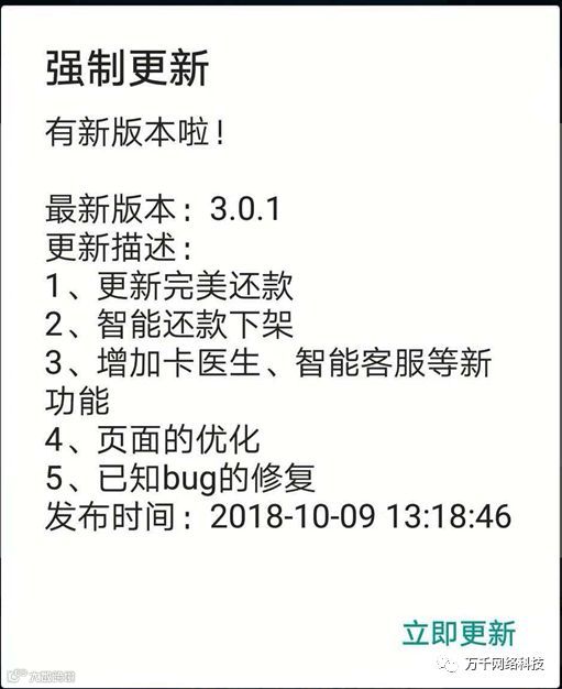 万千智能管家APP已经升级到V3.0.1,新版本更新UI界面,优化完美还款,增加了卡医生、智能客服、新手帮助等功能,解决苹果端界面卡死等BUG,优化代码,提高运行效率。请及时升级到新版。