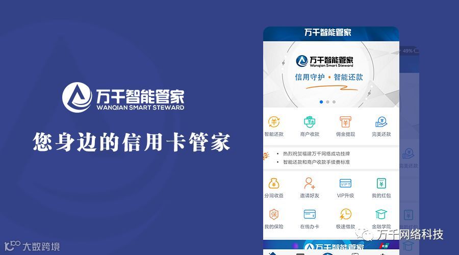 万千智能管家,拥有落地通道,支持智能还款,只需一键设定,更重要的是用户卡里只要预留5%-10%的额度即可完成整个账单的全额还款,为每位用户避免个人信用报告中产生的逾期记录。
