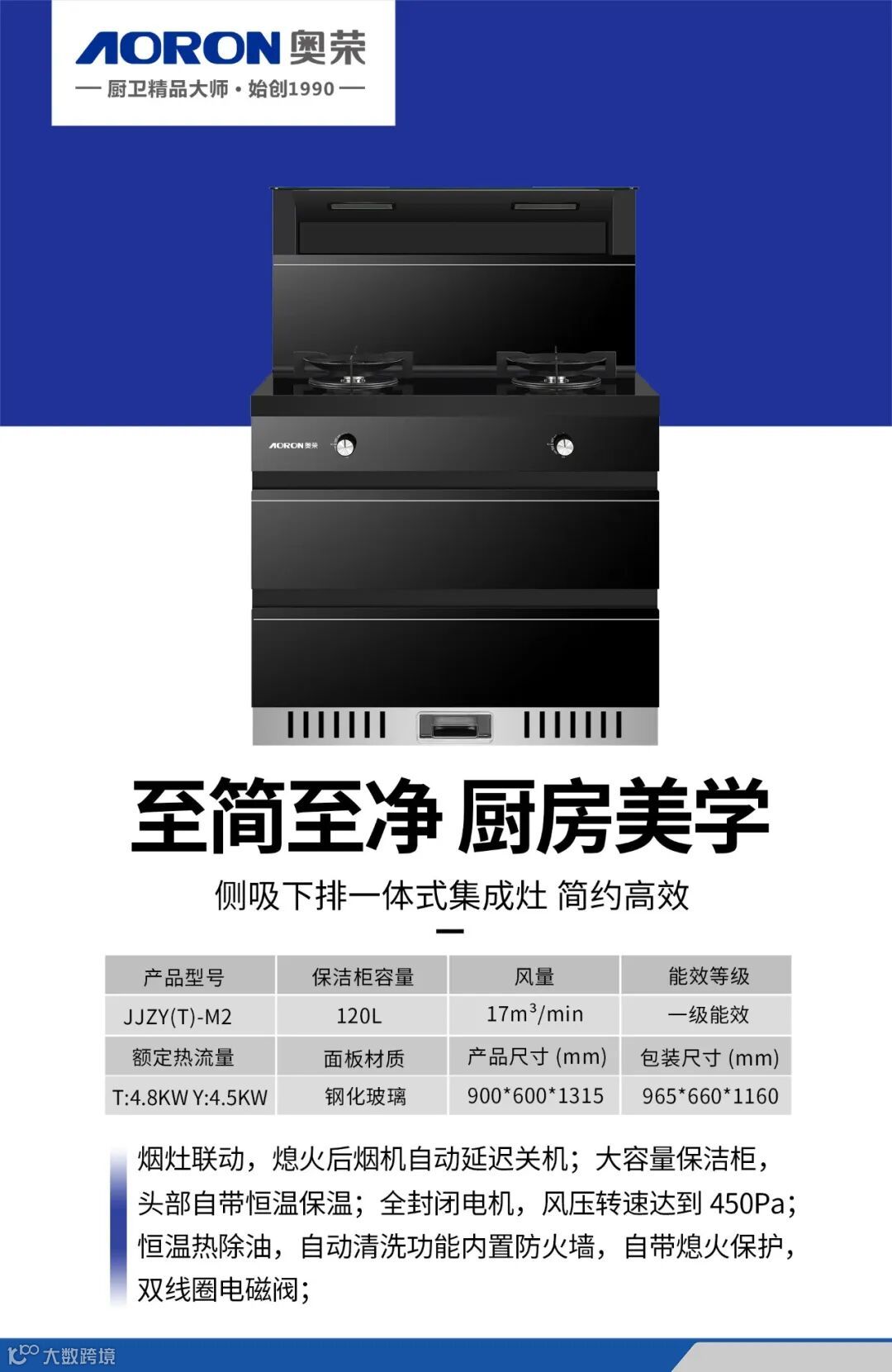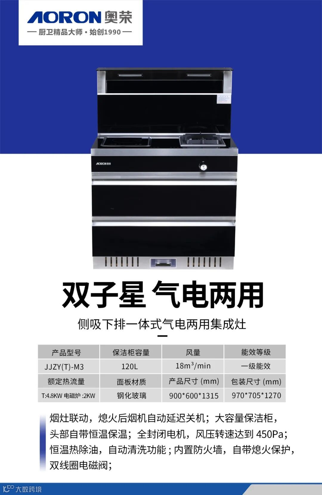 产品特点--集成烟机、灶具(气电两用)、保洁柜;风量:18m³/min,热流量:电磁炉:2000W T:4.8KW 保洁柜容量:120L “烟灶联动”功能,打开灶具,烟机即会同步感应,一并开启,保卫厨房洁净,守护家人健康!