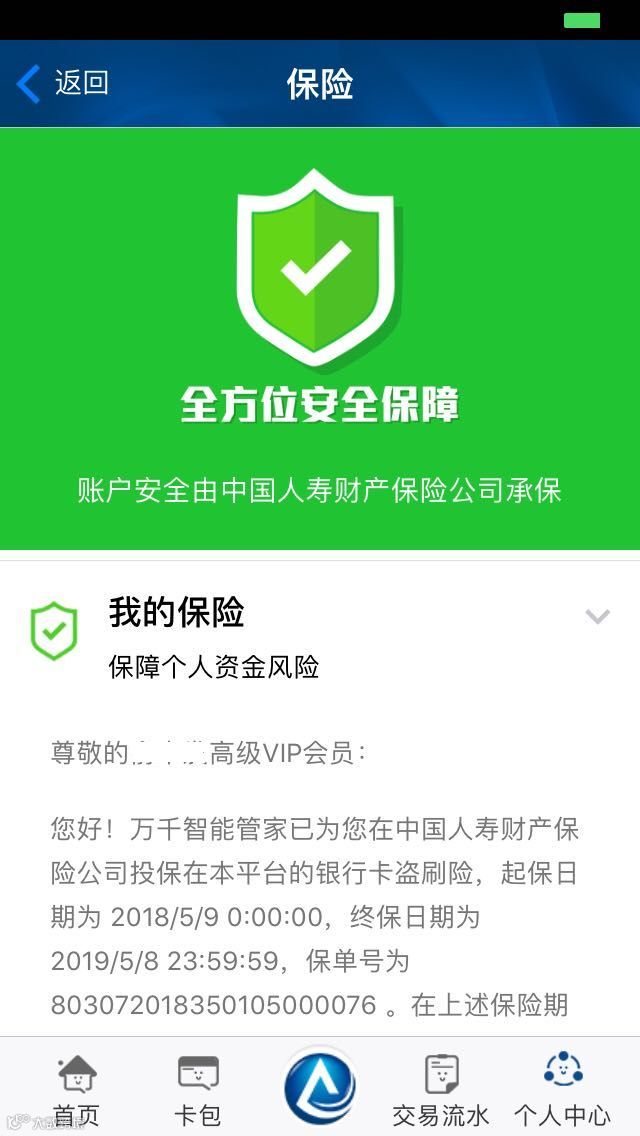 此外,为了确保客户用卡安全,公司和中国人寿进行战略合作,目前平台为所有VIP用户都投保了银行卡盗刷险,客户可以在APP-“我的保险”查看投保详情。