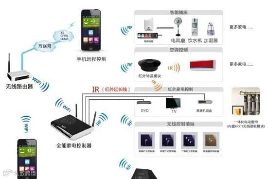 红外转发系统由位于各房间的红外接收器和位于客厅的红外发射器组成。红外接收器接收各种影音设备的遥控器的信号,变成电信号传到红外发射器,红外发射器将电信号转为与原遥控器相同的红外信号,发射给影音设备实现控制。
