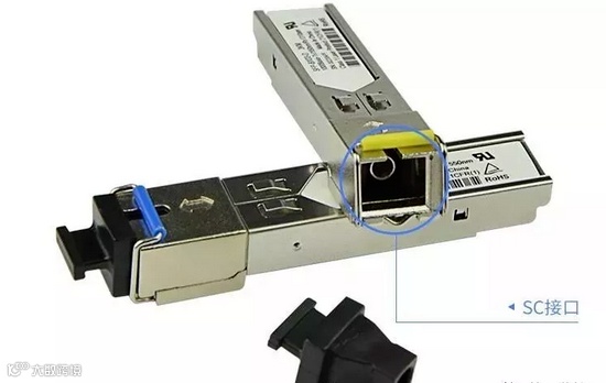 光纤接口类型很多,SC光纤接口主要用于局网交换环境,在一些高性能千兆交换机和路由器上提供了这种接口,它与RJ-45接口看上去很相似,不过SC接口显得更扁些,其明显区别还是里面的触片,如果是8条细的铜触片,则是RJ-45接口,如果是一根铜柱则是SC光纤接口。