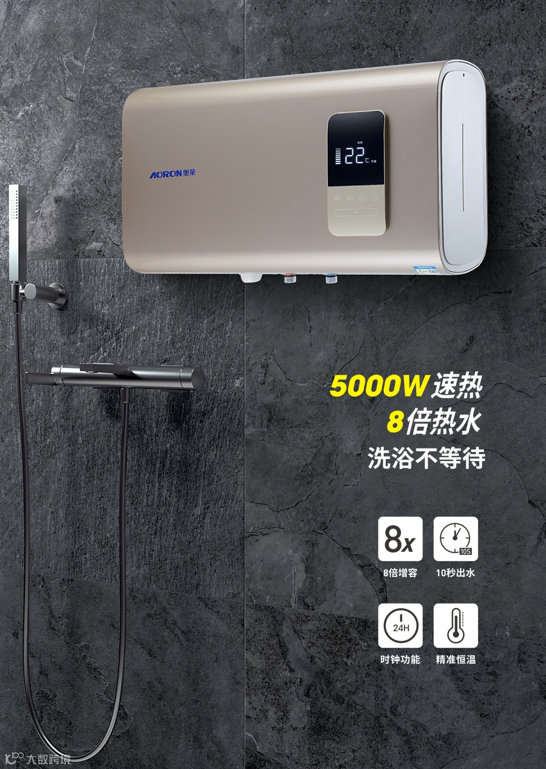 奥荣AD30-813电热水器,5000W大功率,特有8字双胆,分胆速热实力派,舒心洗浴不等待,生活追求高品质。上胆发热管功率5000W,下胆发热管功率3000W;十秒速热,夏天可开机即洗,进水温度较低的冬季也只需预热十分钟,让你告别等待,想洗就洗。