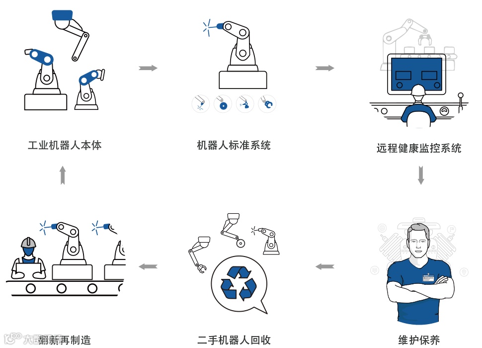 在工业机器人服务领域,哈工智能致力于打造“工业机器人本体-操作编程培训-机器人标准系统-系统集成-实时监控软件-维护保养-二手机器人回收-翻新再制造”的可循环式工业机器人全生命周期生态链。