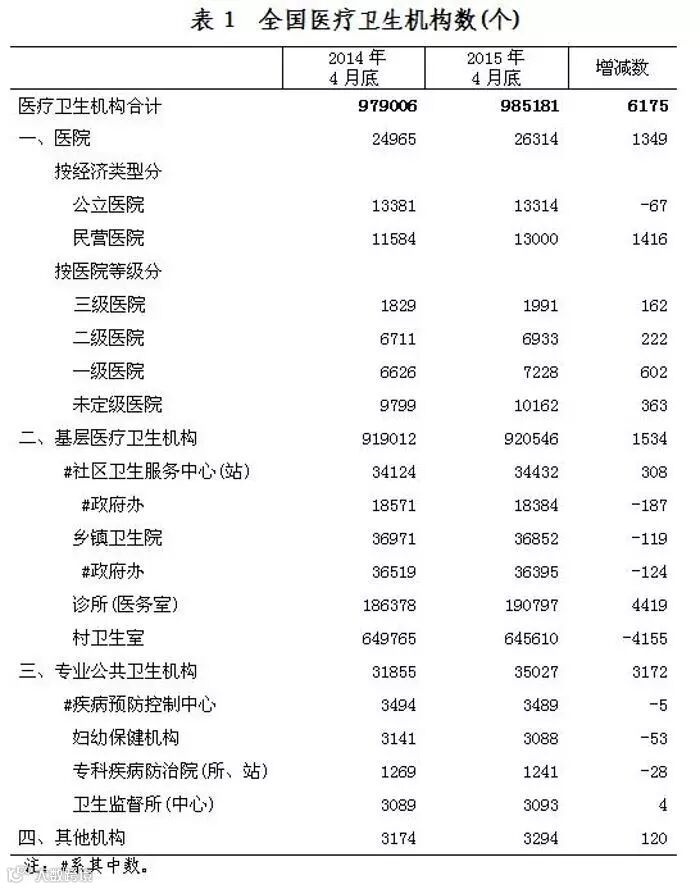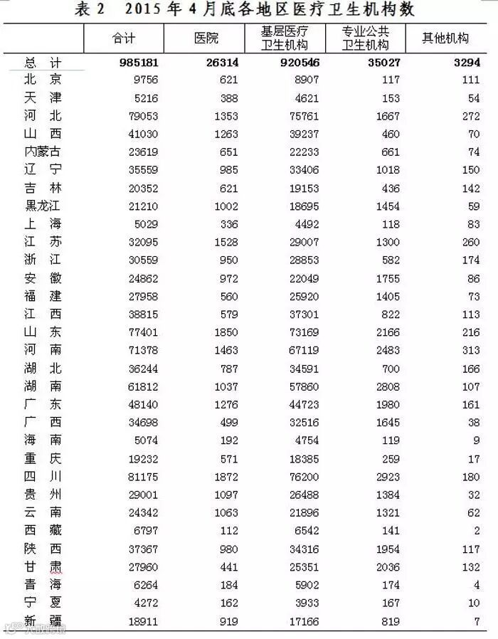 据国家卫计委统计信息中心统计,截至2015年4月底,全国医疗卫生机构数达985181个,其中:医院26314个,基层医疗卫生机构920546个,专业公共卫生机构35027个,其他机构3294个。