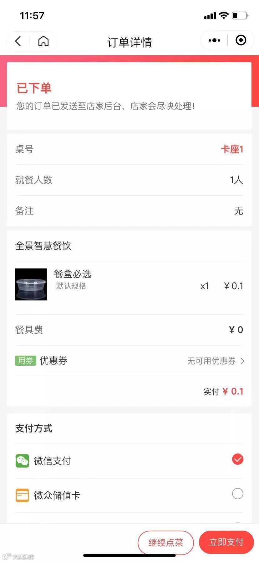 菜品选择完成后可直接支付买单。选择传统方式点餐的用户还可扫描桌上二维码,选择“快捷付款”进行买单。