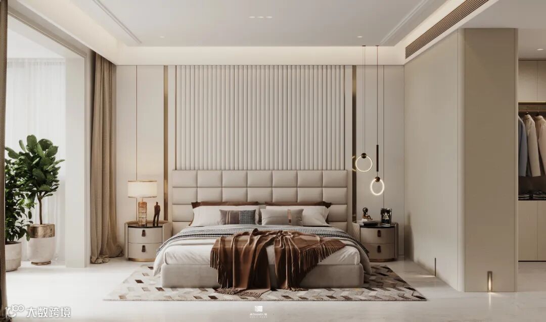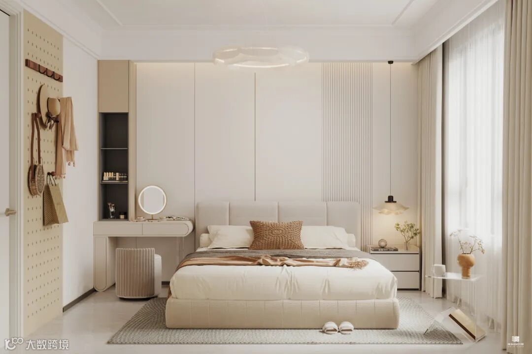 主卧舒适、私密且不被打扰,月牙白、原木色和高级灰巧妙融合,为整个空间带来了细腻而温暖的氛围,设计师还巧妙地在空间中加入了更多的布艺元素,这些柔软、温馨的材质不仅增添了卧室的舒适感,还进一步强调了空间的私密性。