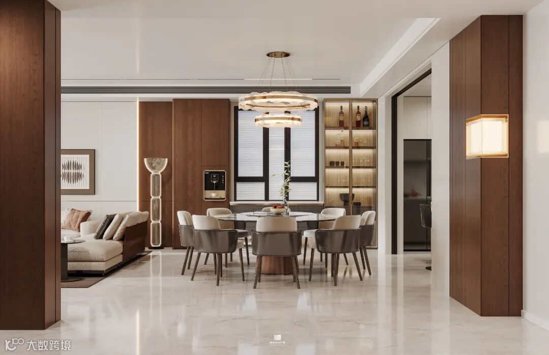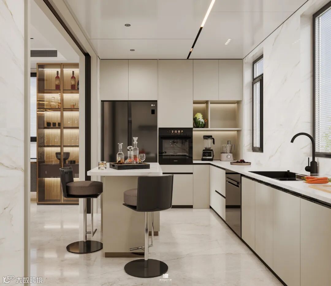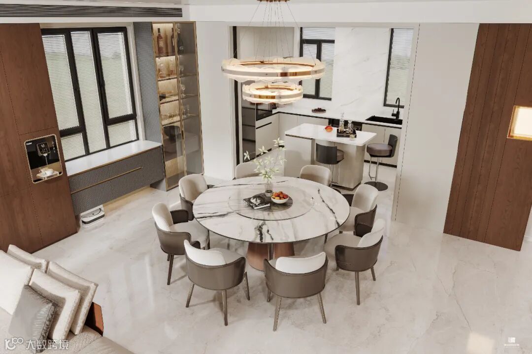 烟火气与欢笑声交织在一起,为空间增添了无尽的温馨与幸福。餐、客空间无痕迹的连接,赋予空间开阔与交流的意义,通过实木、大理石等材质,打造了一个既开放又兼容生活品质的餐厨,诠释着都市新贵艺术、前沿、优雅的生活态度。