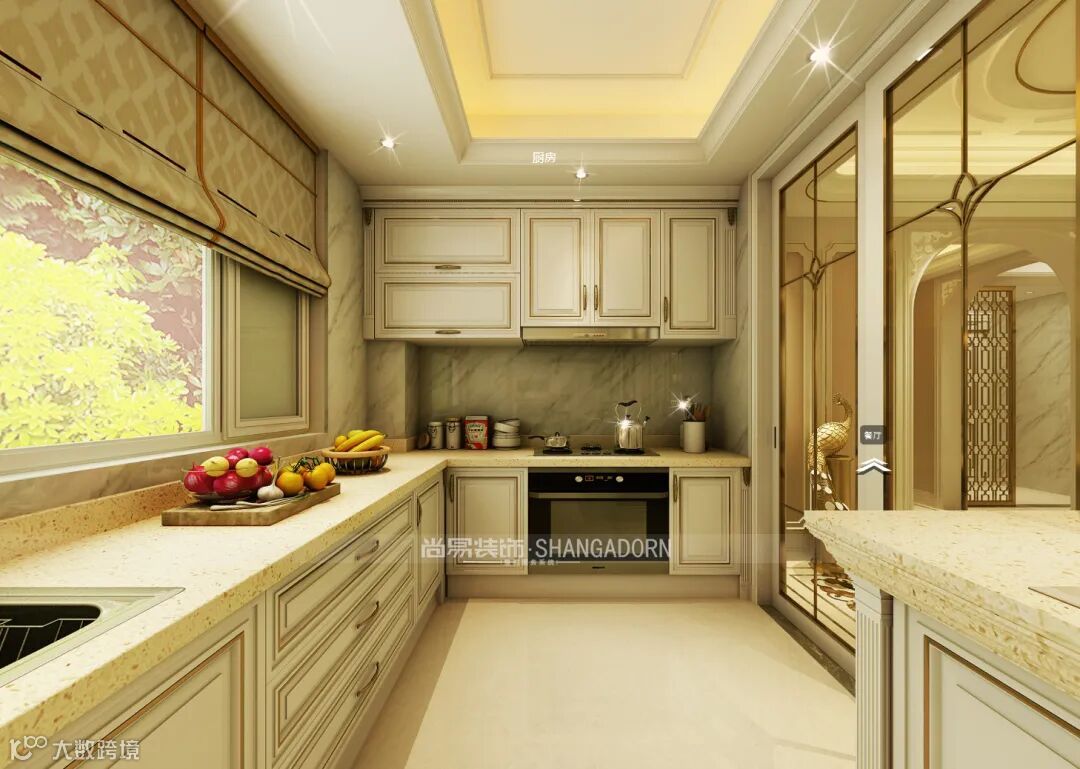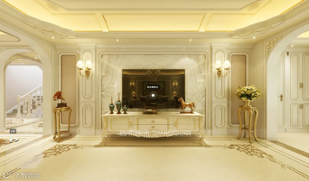 在跟房主前期沟通中,我们了解到房主比较喜欢欧式偏古典的浅色风格,而此房型面积又足够大,能承载欧式的大体积气场,故此做了比较有情怀的典雅欧式设计。