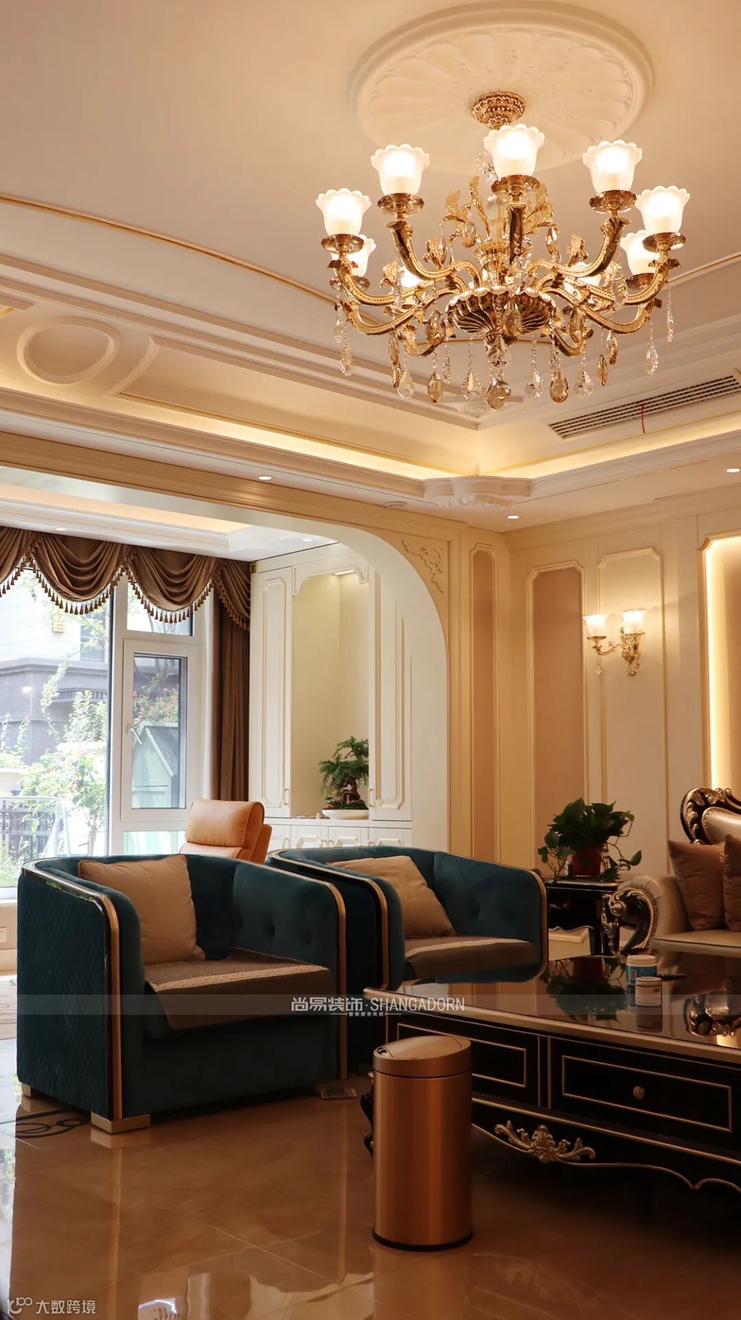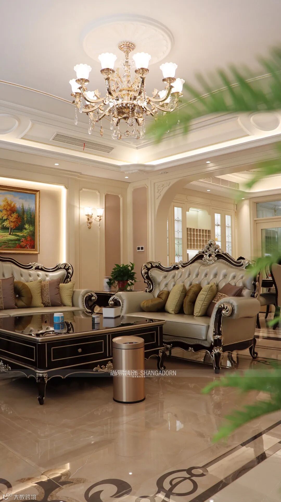 进入客厅,左右对称的弧形雕花垭口,使区域界定更有层次,地面的拼花,又使大体积的家具能有一个显得厚实稳重的地面承载。