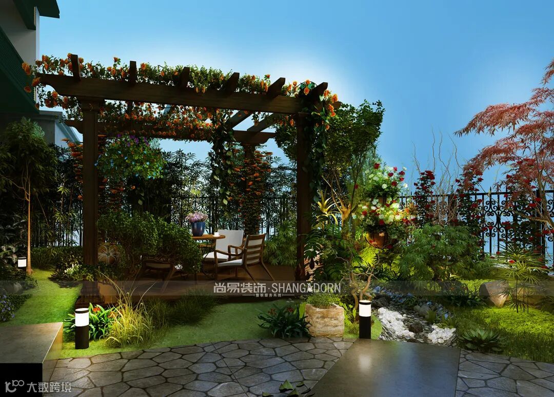 在院子东侧则是一架铝合金的廊架,之所以用铝合金材质是为了不需怎么打理和使用时间更长久。在旁植有凌霄和紫藤花爬到廊架之上,为其消除冷硬感和增加生机气息,也为有阳光下的那一袭凉阴,其下有桌椅,期间又有欢声笑语。而通往廊架的踏步石径则又是房主在外急促的步伐回到家优雅起来的基垫。