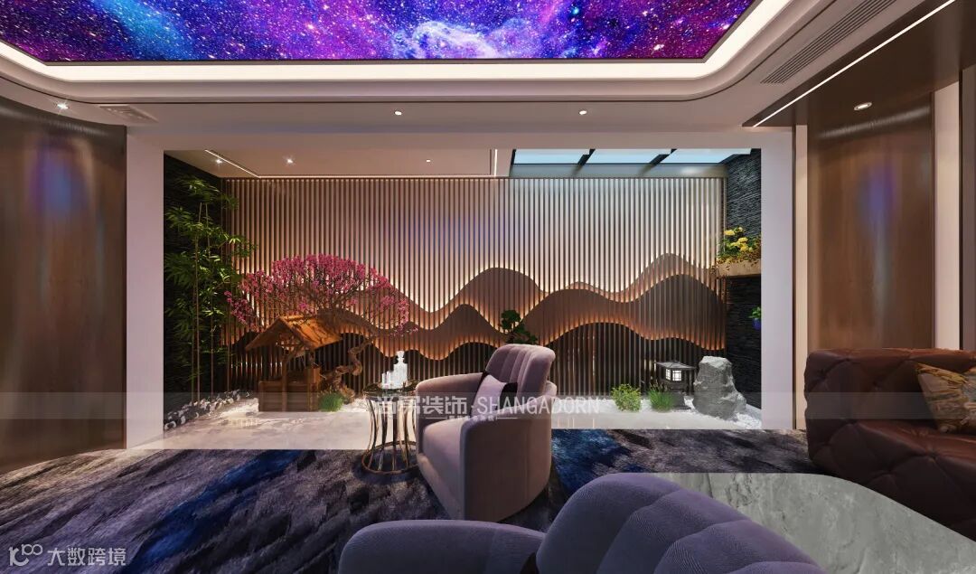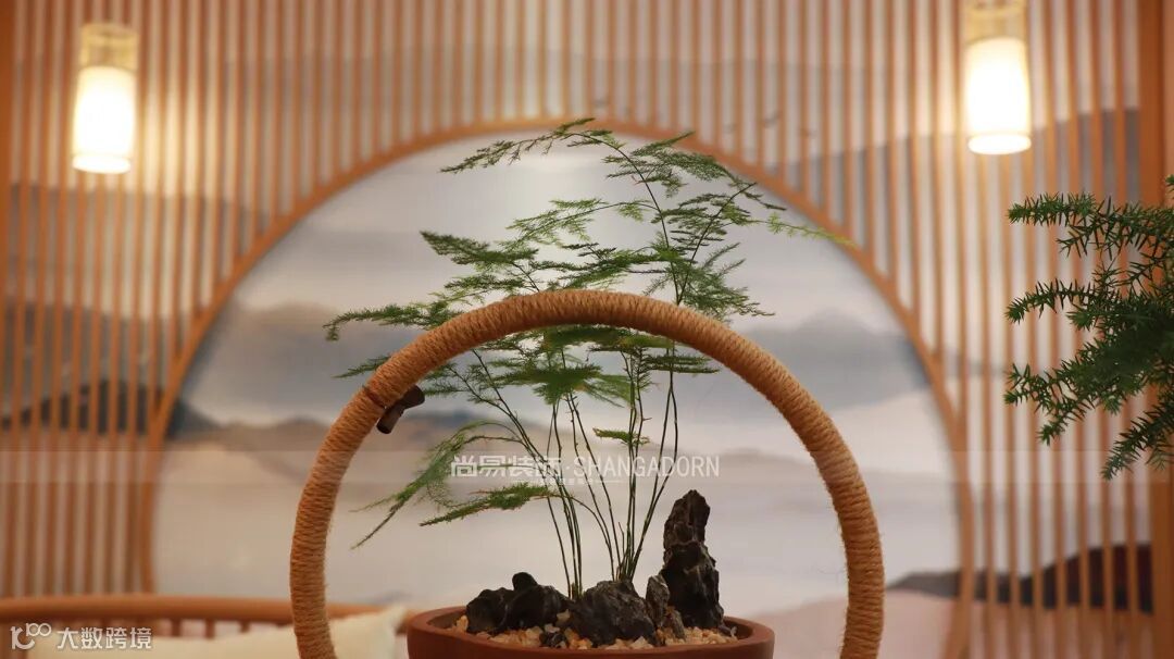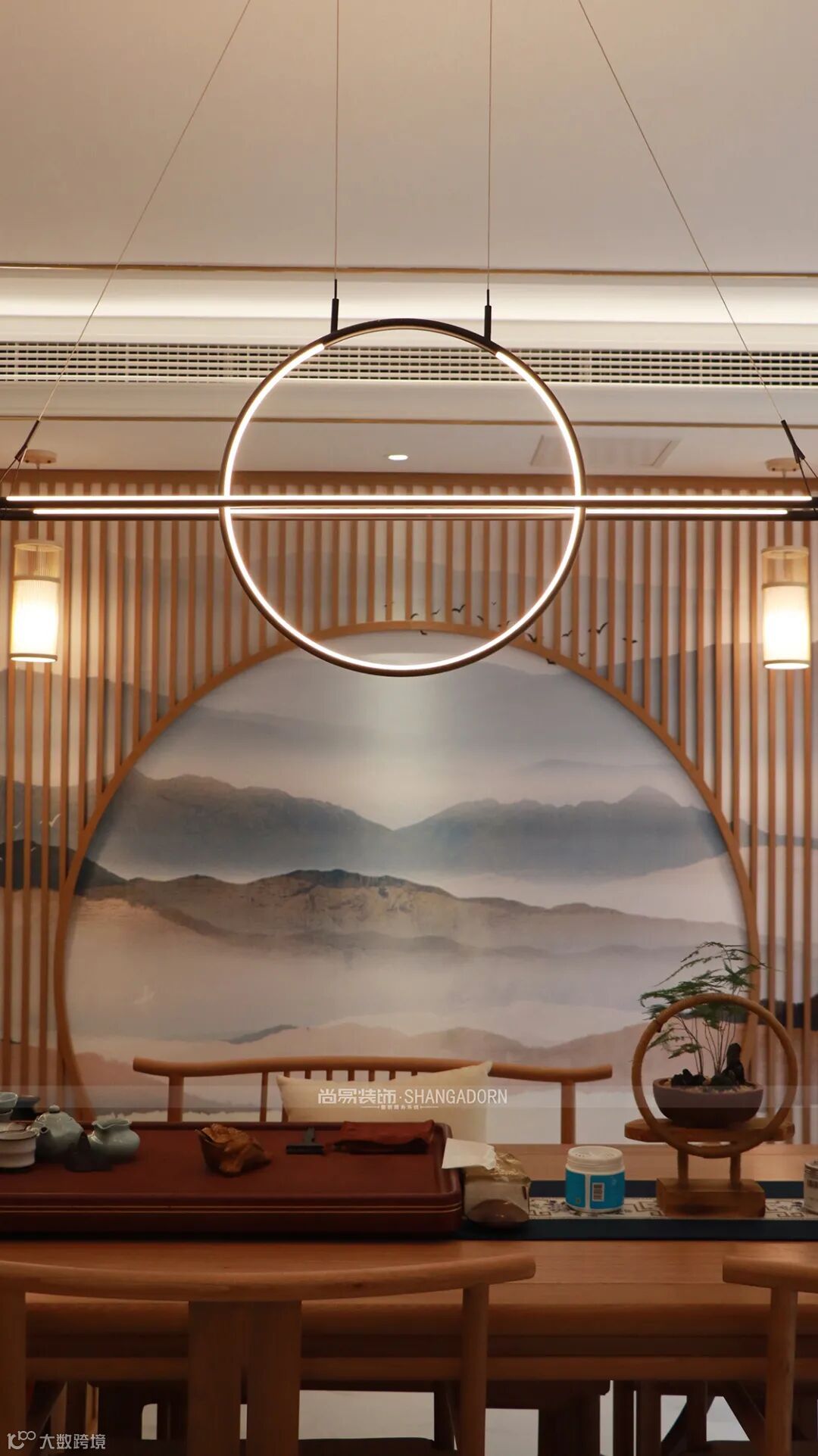 茶桌及摆件等搭配又是将禅意贯穿到底的点睛之处,让置身其中的你能凝神静气的去感受内心。北侧采光井墙面运用深浅颜色叠加山形的方式有了心理空间的延伸,不止于此,还有远方。