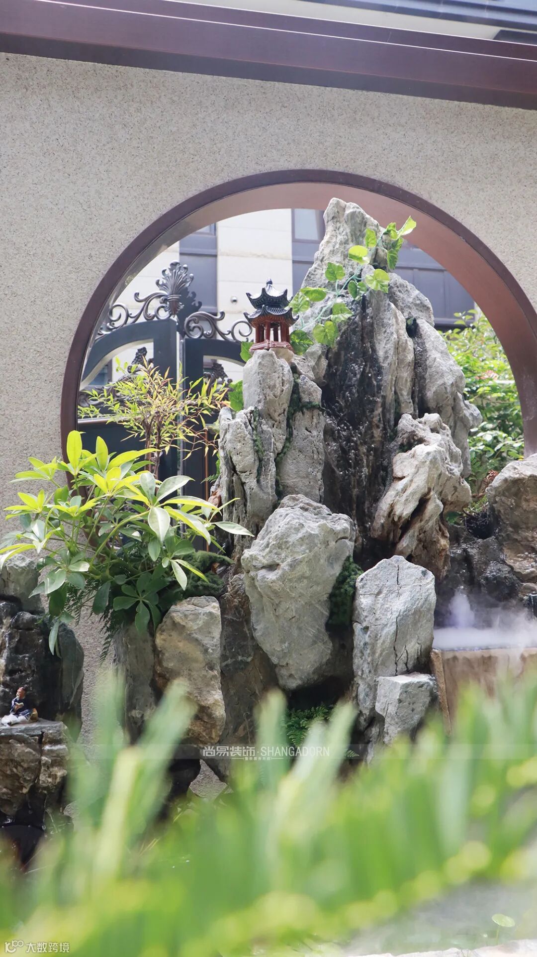 进入院子,首先入目的是一个满月漏窗影壁,透过漏窗呈现出来的是其后的流水假山,这样既能增加回旋空间和遮挡,又能比较自然地将空间做了延伸,也有一定的人文情趣。主路面用大块铁锈石拼铺,去除了人工施工的匠气。