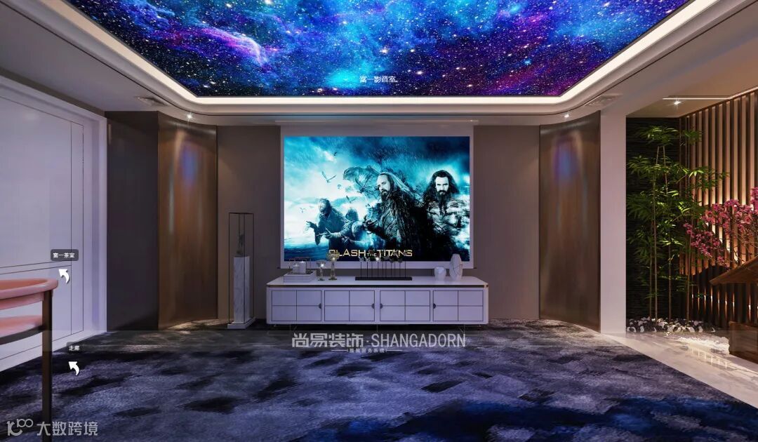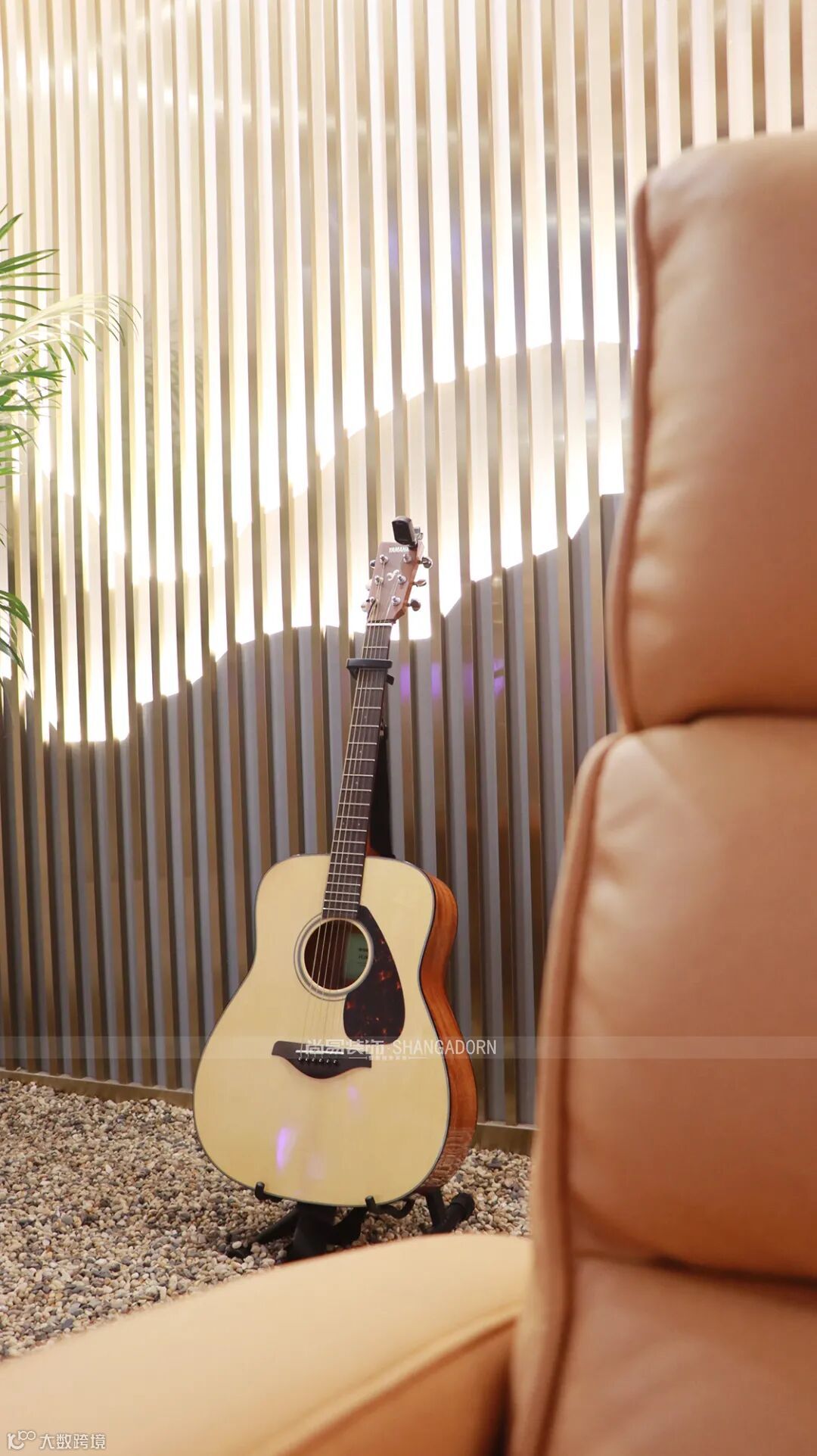 影音室延续了茶室的恬淡、佛系风格,墙面,顶面弧形造型的运用,壁布,木质的搭配,在其中让人更有依托融入感,南墙的双色山形外罩不锈钢条格,其脚下的禅意干景,让空间又有了诗。这里和文艺电影真是绝配。