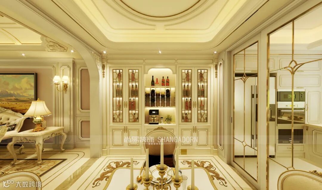 客厅联通的北面是矩形空间餐厅,地面依旧点缀拼花,长方餐桌使空间协调的同时又更适合房主三口家人的就餐。旁边的酒柜能很好地增加储物空间并通过造型、玻璃门和灯光的变化将空间精致化。北面墙体造型又是入户目光所及之处的玄关。顶面弧形的边顶及石膏线、钛金,不仅增加了材质立体变化,又打破了矩形空间的呆板感。