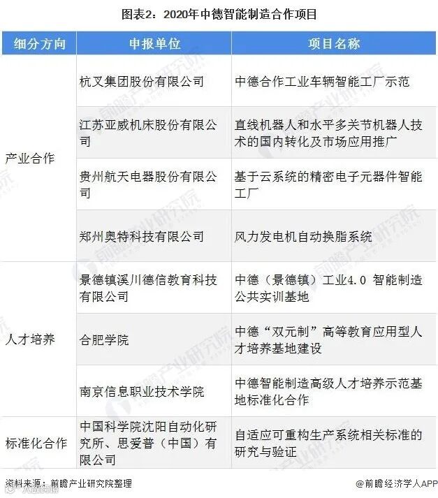 2020年中德智能制造合作项目包括中德合作工业车辆智能工厂示范、直线机器人和水平多关节机器人技术的国内转化及市场应用推广、基于云系统的精密电子元器件智能工厂、风力发电机自动系统等,在项目过程中,将吸取德国智能制造经验,有望经验推广,进一步提高我国智能制造水平。