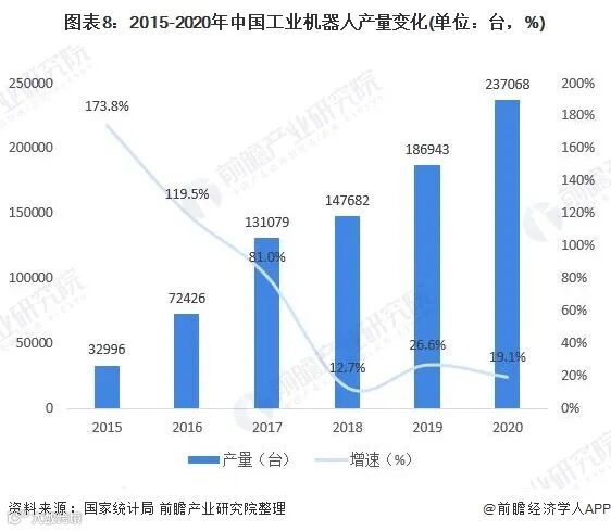 在智能制造领域,近年来发展最受瞩目的莫过于工业机器人,工业机器人作为推动制造业转型升级的重要力量,目前已广泛应用于汽车及汽车零部件制造业、机械加工行业、电子电气行业等领域。2020年全国规模以上工业企业的工业机器人产量再创新高,累计达237068台,同比增长19.1%。