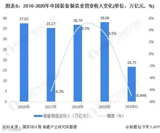 根据国家统计局公布的数据显示,近年来我国装备制造业主营业务收入呈现增长趋势,2019年我国装备制造业主营业务收入达到38.06万亿元,同比增长3.5%,增速较2018年有所放缓,2020年受新冠疫情影响,2020年上半年我国装备制造业整体营业收入为16.75万亿元,同比下降6.94%。
