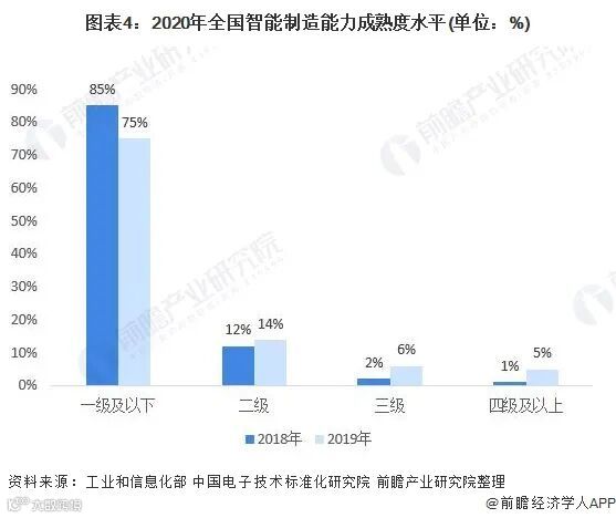 随着国家不断推动智能制造产业发展,全国智能制造能力成熟度提高,根据工业和信息化部和中国电子技术标准化研究院,2020年全国制造业智能制造能力成熟度较2019年有所提升,一级及以下的低成熟度企业数量减少10%左右,三级以上的高成熟度企业数量增加了8%左右。75%的企业开始部署智能制造。