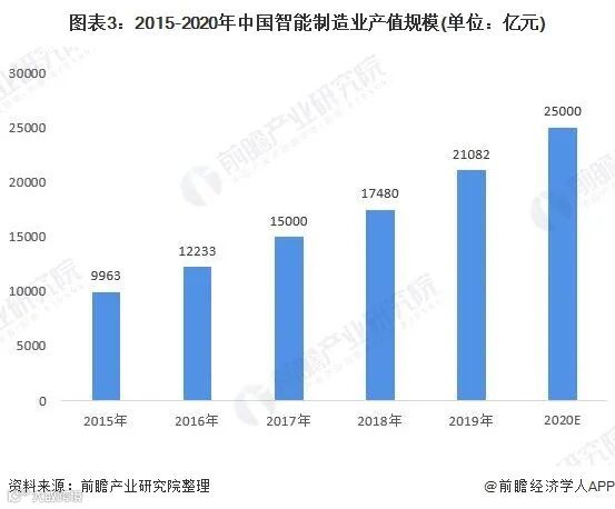 图表3:2015-2020年中国智能制造业产值规模(单位:亿元)