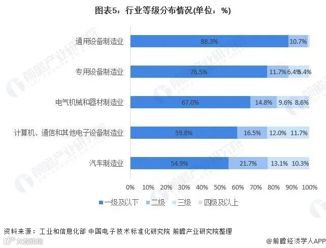 在智能制造技术赋能下,我国智能制造水平不断提升,使得智能制造应用范围与应用程度不断提升。其中,汽车制造业智能制造应用水平高于全国平均水平,二级、三级行业占比位居全国首位,表明汽车制造业智能制造能力水平保持领先优势。