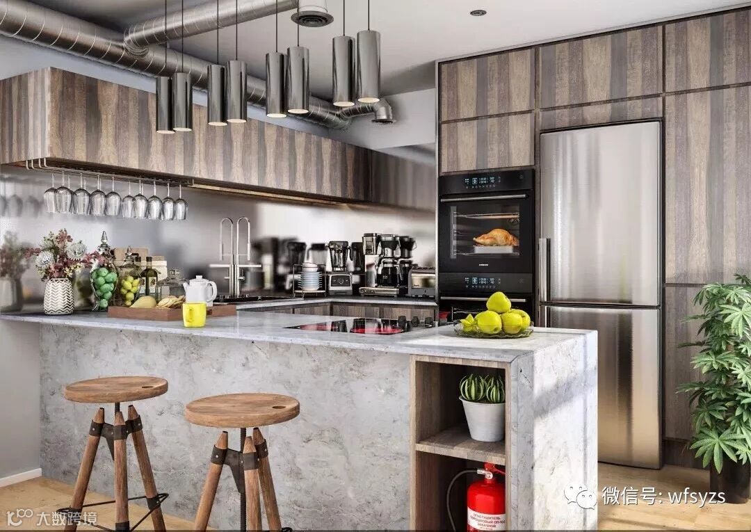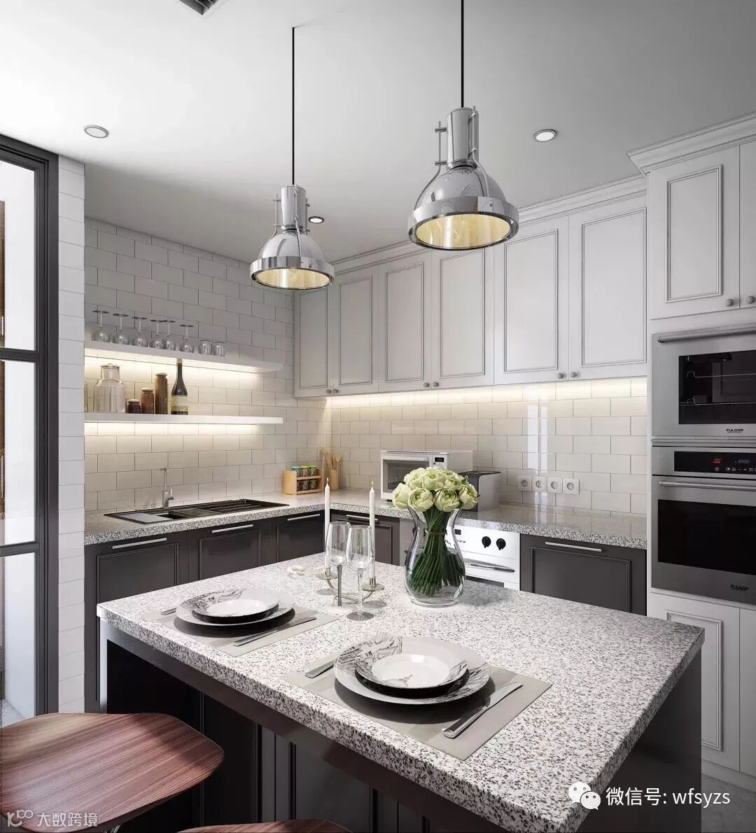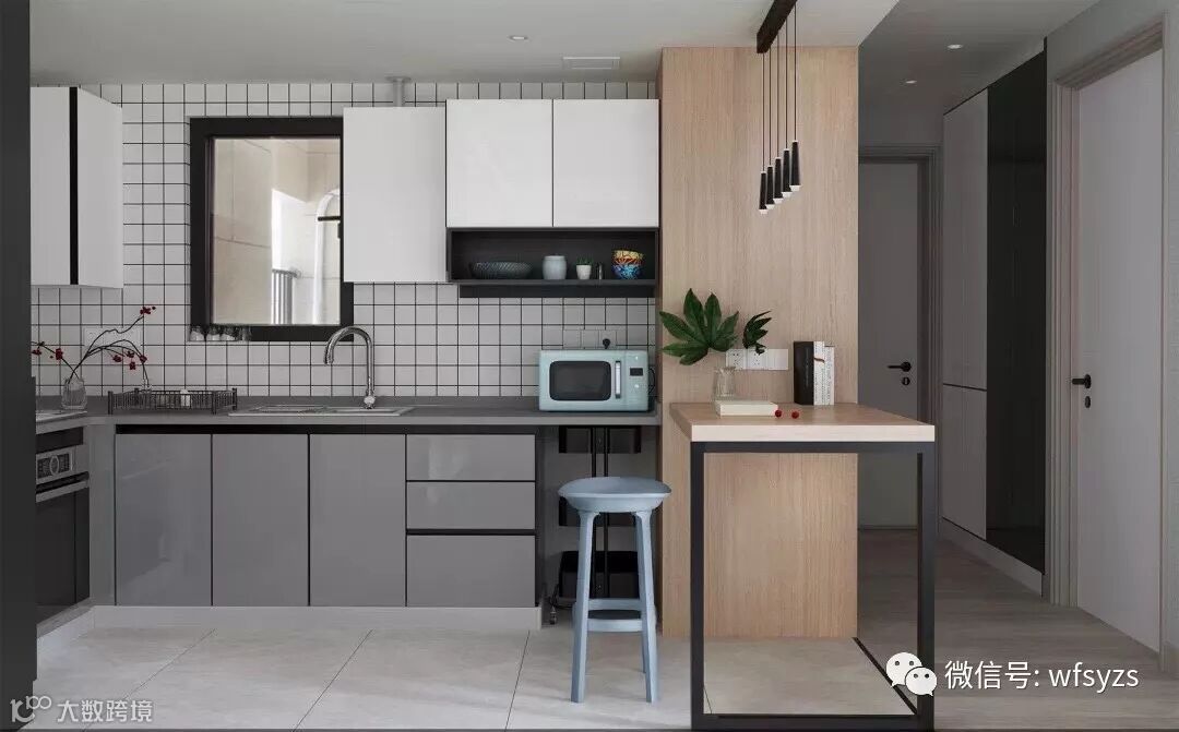 在L型厨房中设置一个简易的小吧台,不仅会让空间瞬间充满小资情调,符合当下对于精致生活的追求。而且可以更合理的利用家里的鸡肋空间,划分出一个新的功能区,在这里可以完成传菜、吃饭等日常活动,分担了厨房的部分功能。