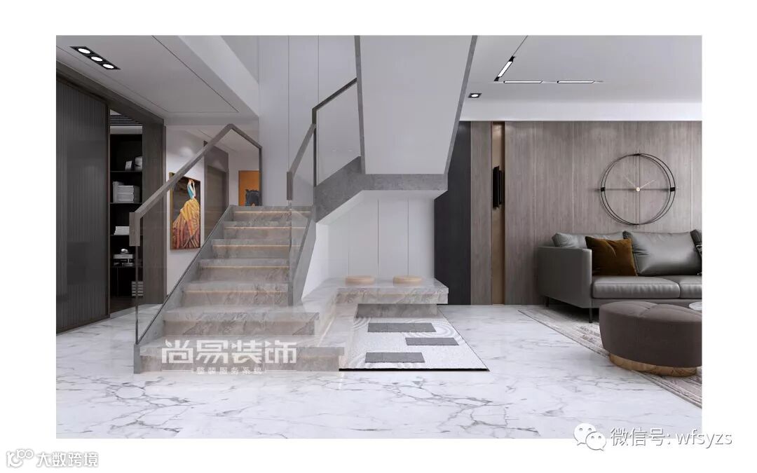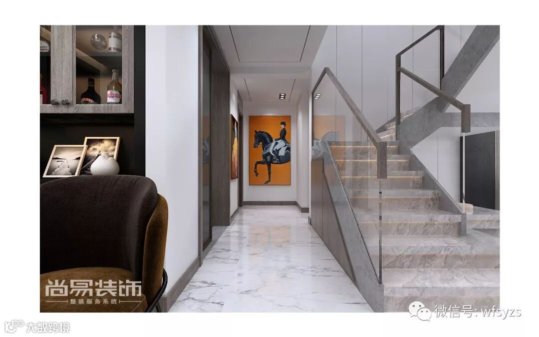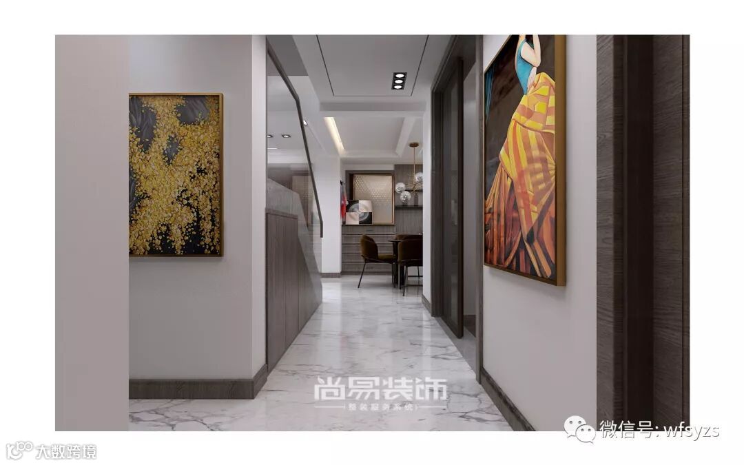 走廊同样打破了原本的规格、不均匀筒灯的编排、同样的简单的抽缝设计与客厅进行了呼应