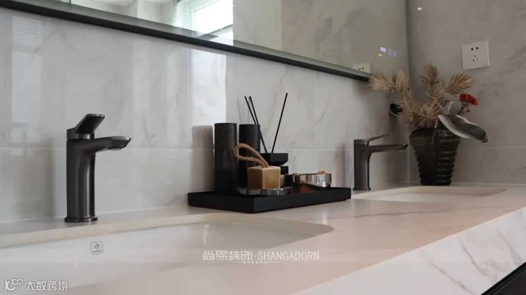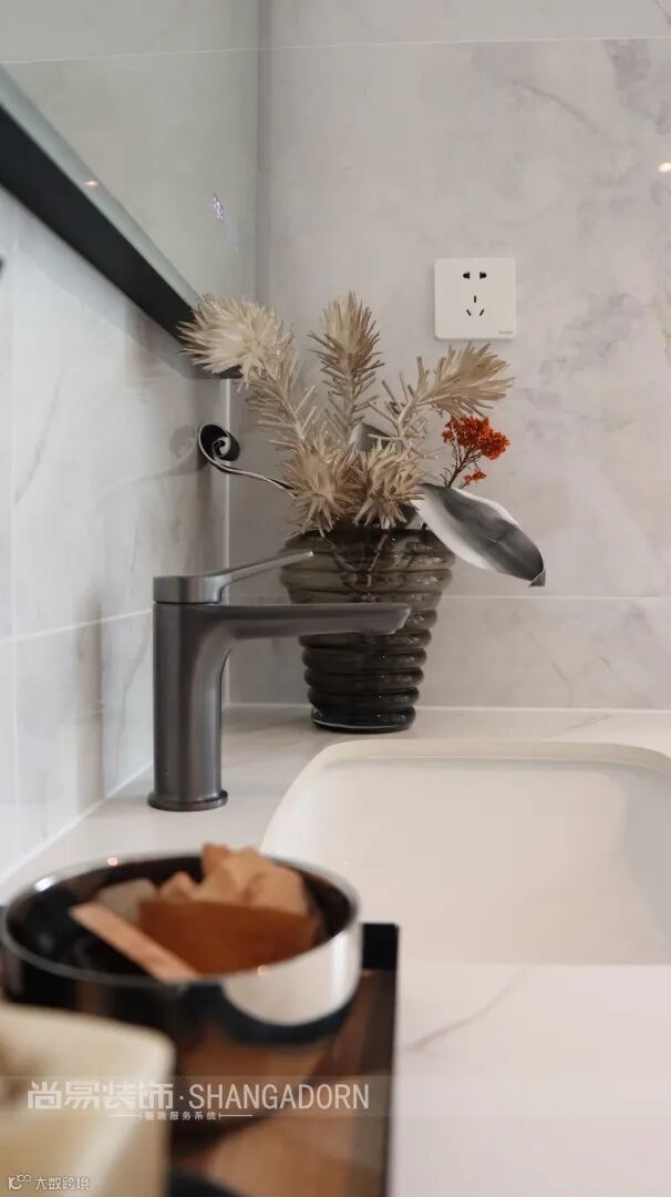 ▲整个空间设计以现代手法为主,在配色上,白灰与大理石打底,带有禅意的马醉木让空间生机感立显,整个空间像一块温润的暖玉,让生活在这个空间里的人尽可能的舒展身心。