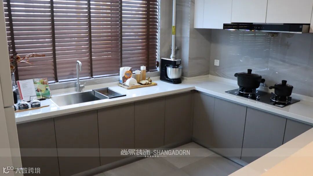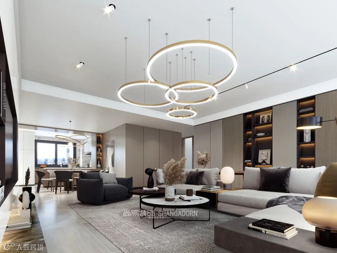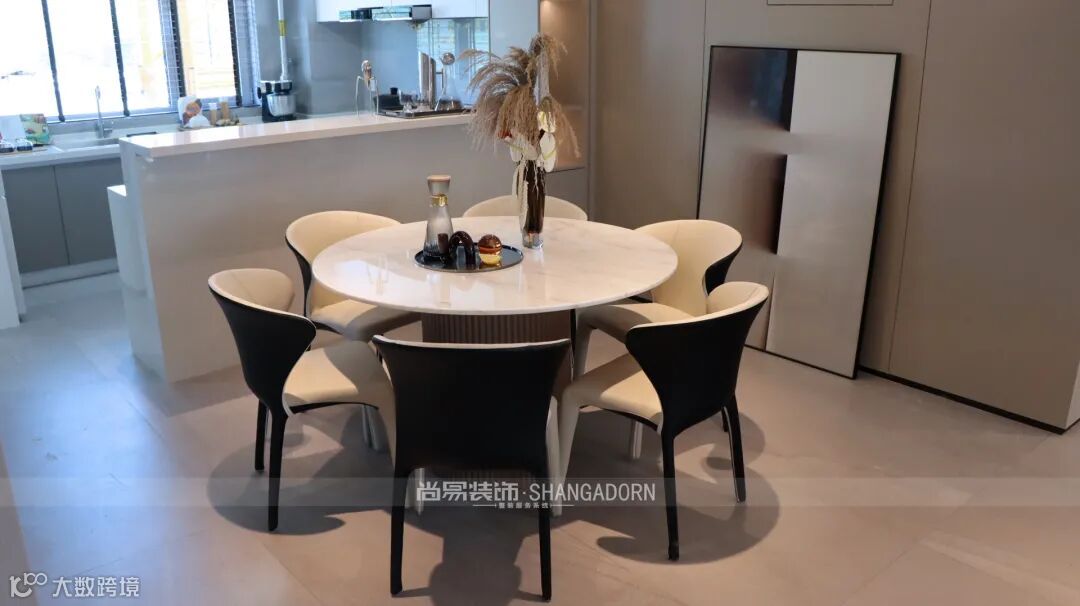 ▲客厅、餐厅、西厨保持互通,秩序井然而不失家的温度。西式岛台,造型简约、线条柔和的家具,组合艺术吊灯加以点缀,配合良好的采光,实用性与艺术性完美结合,舒适简约。