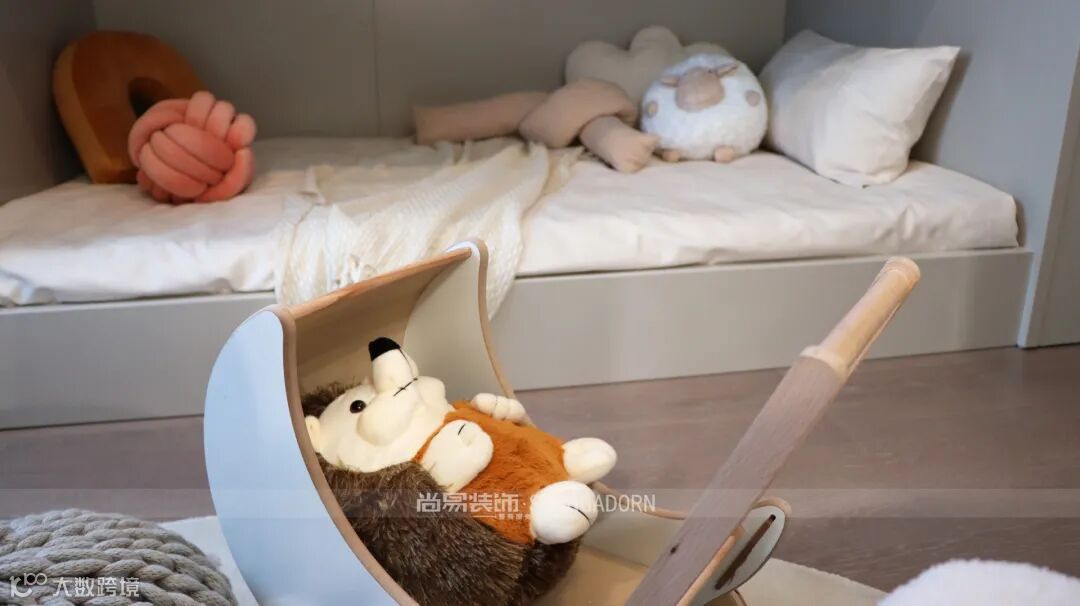 ▲儿童房浅灰色的整体空间,布置一个上下铺带储物柜框架的床铺,布置童趣的抱枕装饰,也让空间充满活泼可爱的舒适氛围。