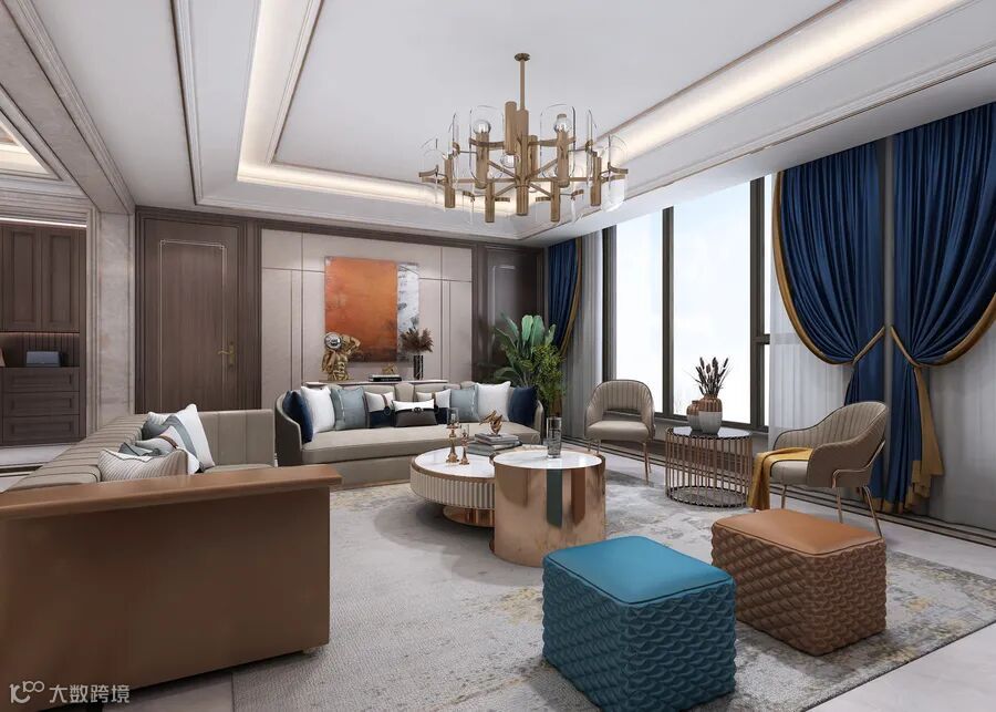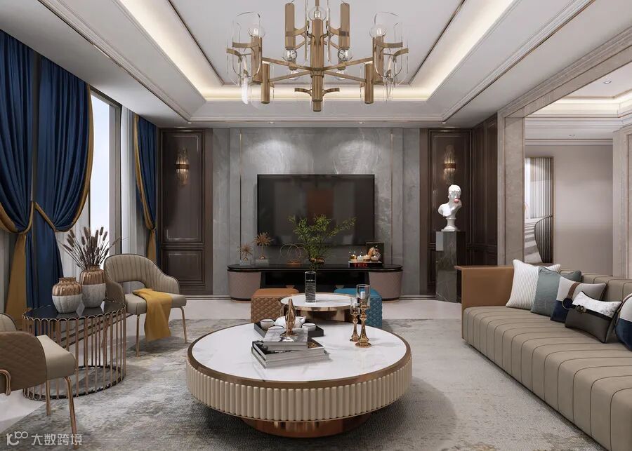 宽敞明亮的客厅,金色与灰色的搭配