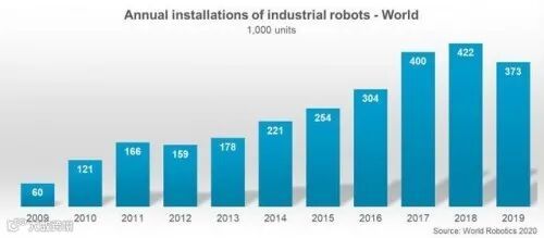 近日,IFR《全球机器人报告2020》报告中称,全球范围内,2019年工业机器人年度安装量排名前五的市场分别是中国、日本、美国、韩国和德国。中国是目前世界上最大,增长最快的机器人市场。IFR 预计,2020年及2021年有望恢复增长,增速分别为11.64%和 10.64%。