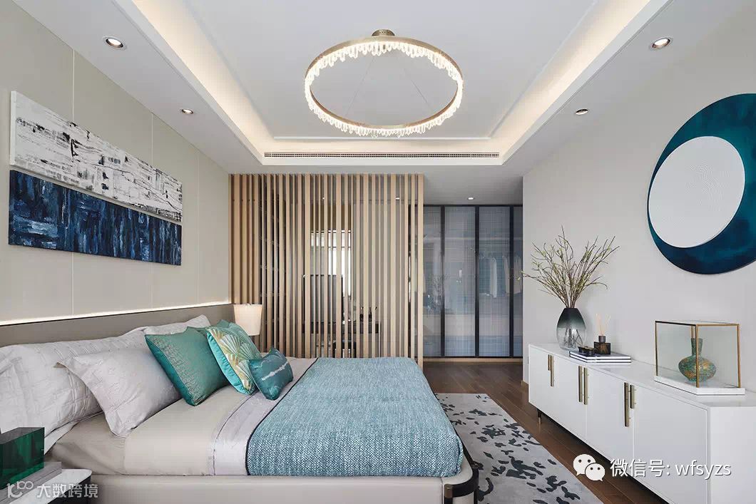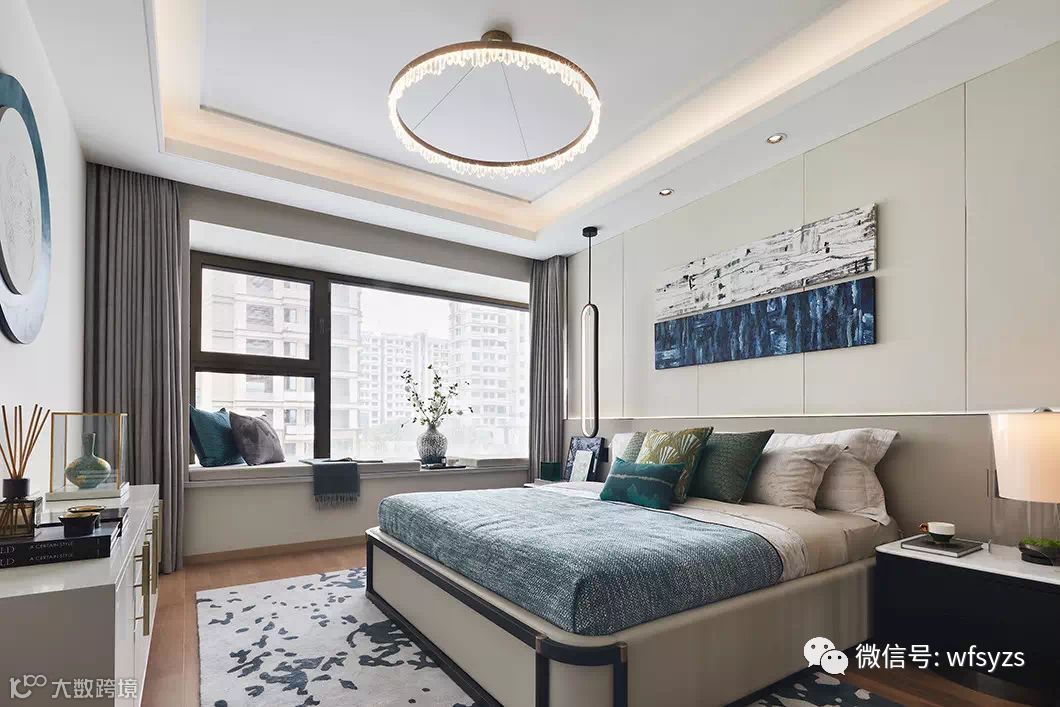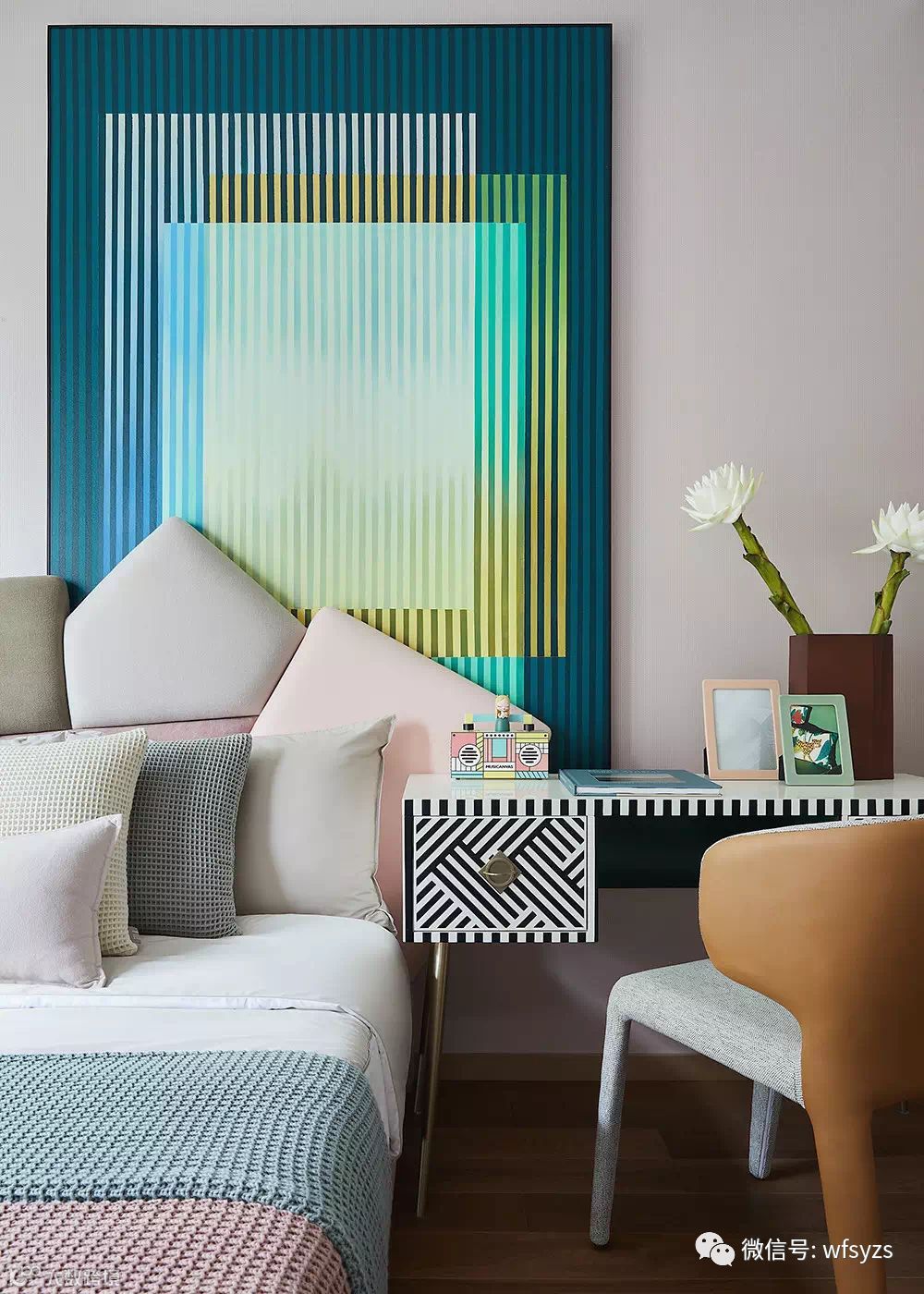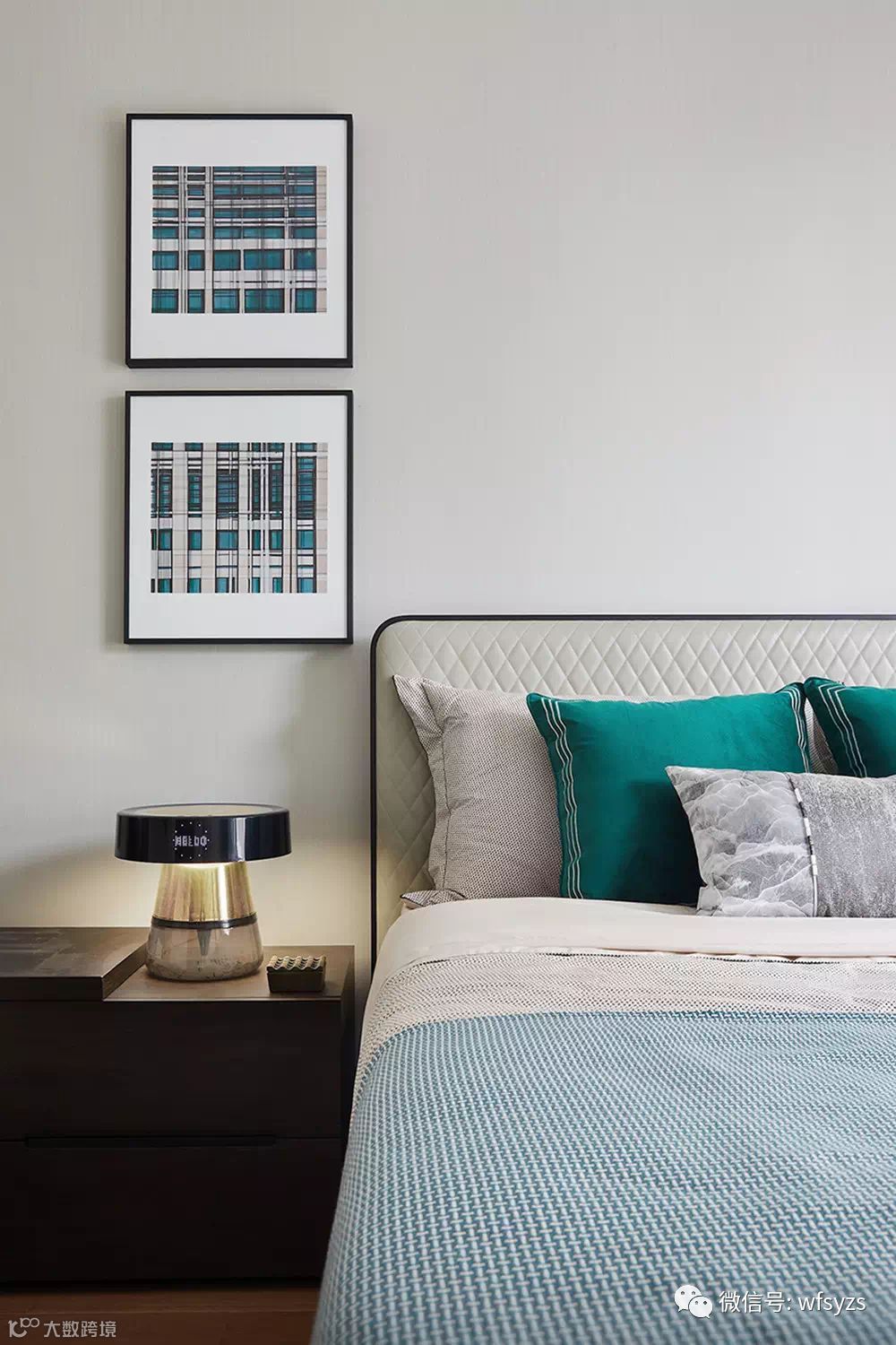 床头灯具以高低错落的组合形式打破常规,提升层次。立体感极强的挂画,为主卧的视觉焦点,家具造型也更为凸显现代气息。