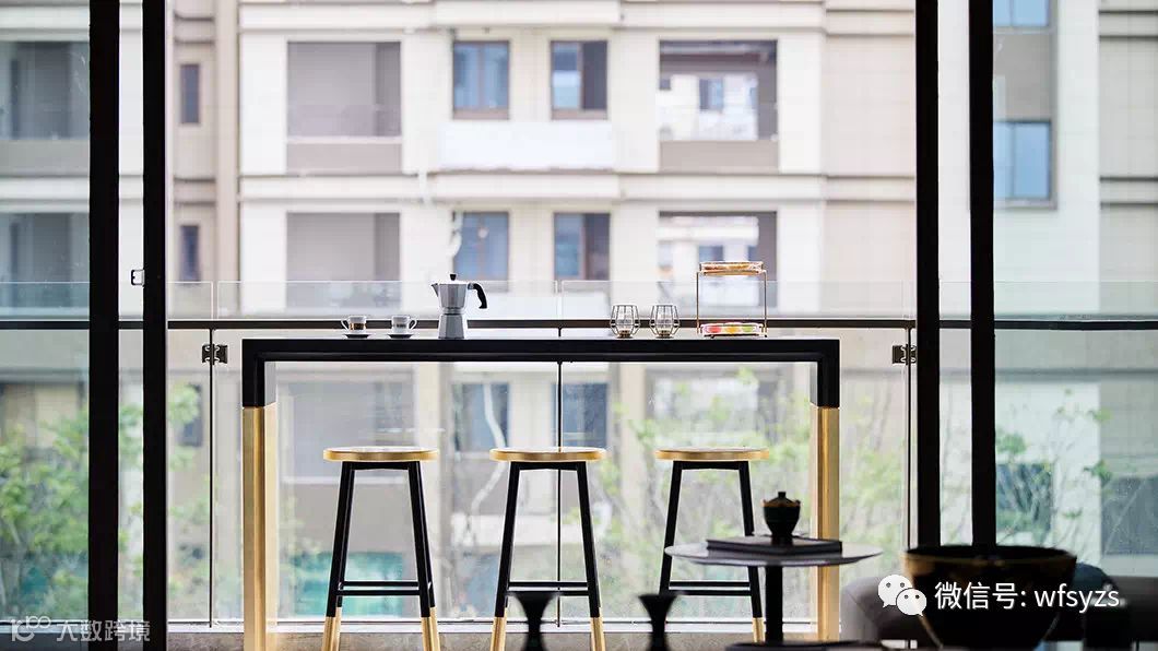 观景阳台是客厅向室外的延伸,以实木和金箔打造吧台区,精致与休闲感并存,于此尽揽户外风光,颇有“闹中取静”、“忙里偷闲”之态。