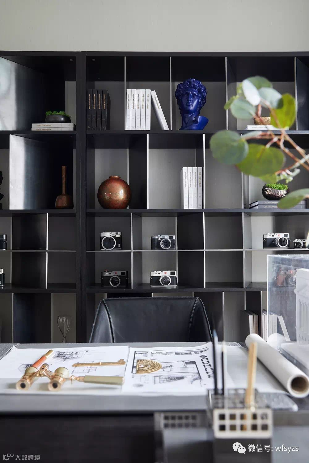 书房则以沉稳为主基调,不规则书架设立多样陈列方式,格架大小不一,挡板倾斜角度各异,兼具功能、特色与美观,同时便于物件和藏品的展示和存储。