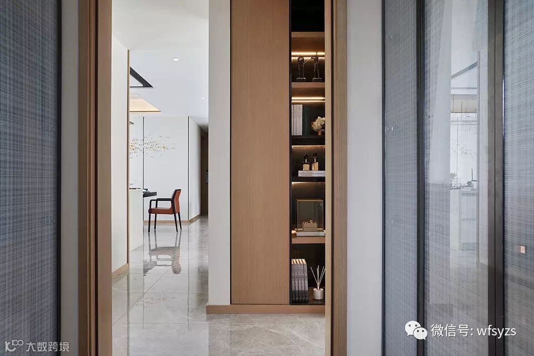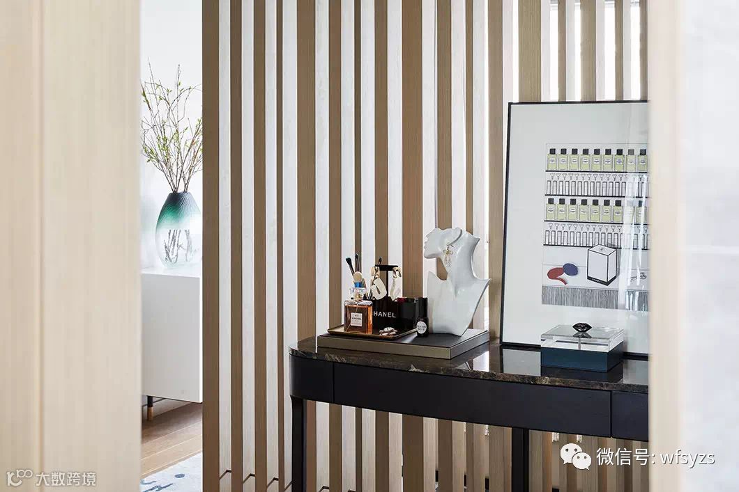 透过木格栅,主卧亦可一窥衣帽间的风采。展示性与功能性兼并的衣帽间设立于走廊尽头,设计师在不经意的笔触中,将低调奢华的高贵感勾勒而出。