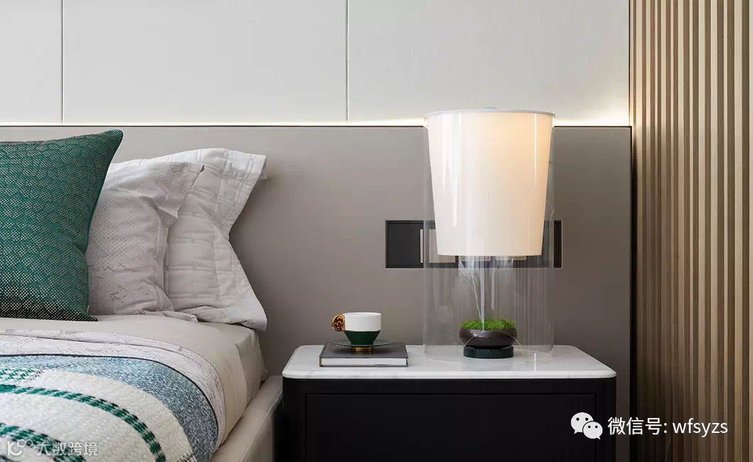 主卧床背与床一体化设计,空间关系更加完整,隐藏灯带的设置,运用光与影营造温馨与时尚氛围。