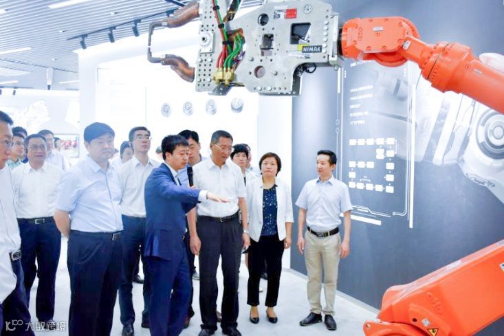 图:哈工智能副董事长兼总经理乔徽,为盐城市政府领导一行做讲解