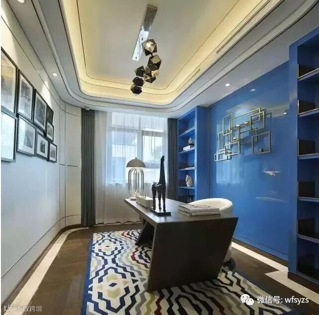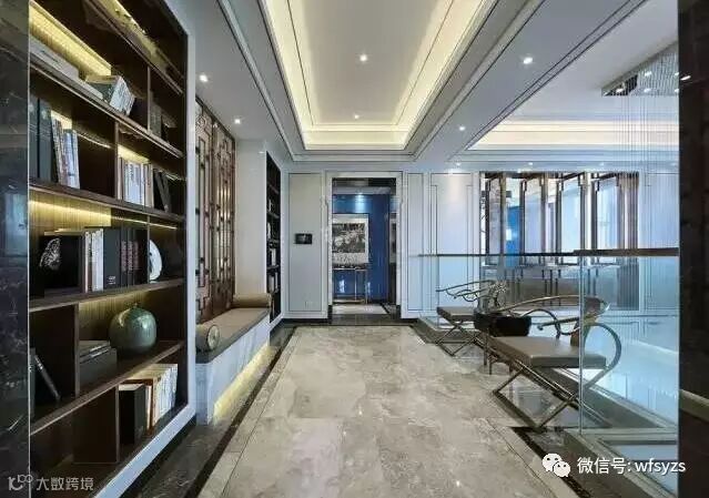 干净利落的线条,静谧的灰、素简的白、优雅的棕。走道打破狭长增设书廊,采用透、挑、借等中式建筑设计手法营造了一个凭栏阅的书香意境。