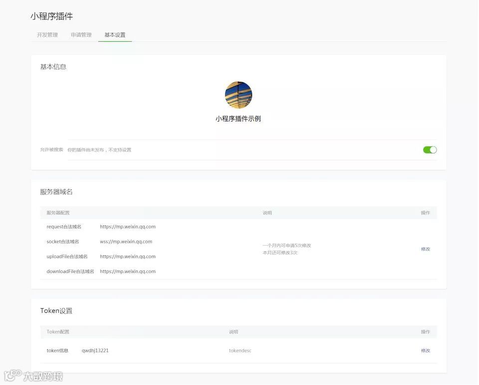 ③ 设置插件的服务器域名及Token信息后,即可开发插件。详见《小程序插件接入指南》、《小程序插件开发文档》;