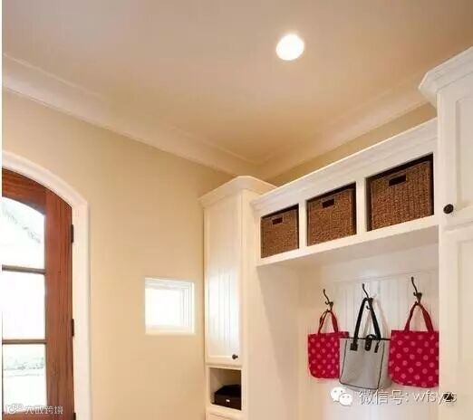 玄关处空间虽小,但是也是一个收纳的好地方,而最重要的莫过于鞋子了,若只是摆放上鞋柜又觉浪费了空间,将衣柜、鞋柜、收纳盒集合于一体,也不失为一个明智之举。太过繁缛的设计,会给空间带来视觉压力,简单的设计将美观性与实用性完美结合在鞋柜之上