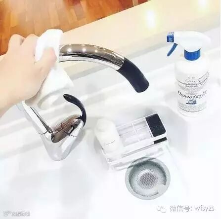 洁净如新的水槽旁放着各种不同功能的清洁剂,让人难以想象厨房是很多女人的灾难现场!