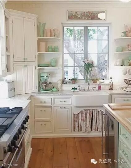 田园家具多以奶白象牙白等白色为主,而在家庭中厨房使用田园风格的最多,奶油绿色流露自然清新气息的设计,小碎花又宛若姑娘十八清纯脱俗的气质,无不让人心潮澎湃,浮想联翩。