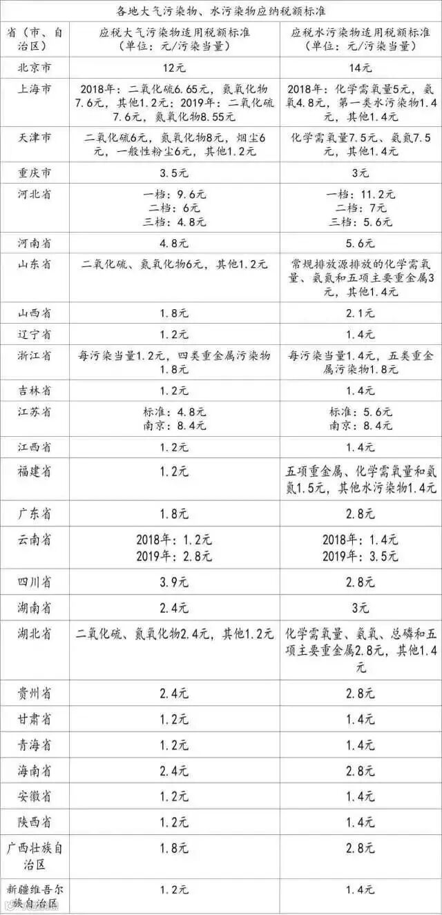 截至目前,我国已有30个省市自治区按法定程序出台了本地区应税大气污染物和水污染物的具体适用税额。具体标准见下图: