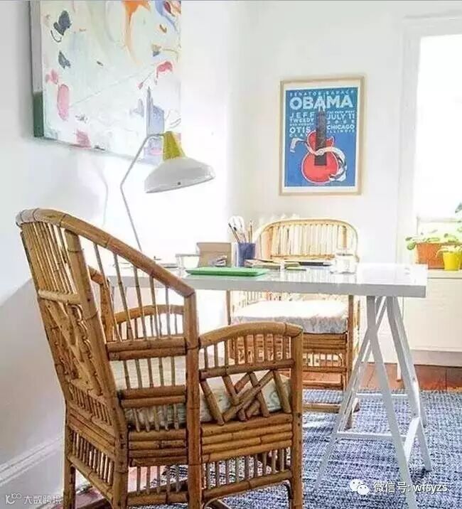 书房设计一样充满品味,简单的书桌满足两人共同使用,竹制的椅子带来复古的感觉,再装点上艺术画作,魅力满分。即使是书桌上的物品,随意摆放也能构成一幅画,可见设计师在细节之处的用心。