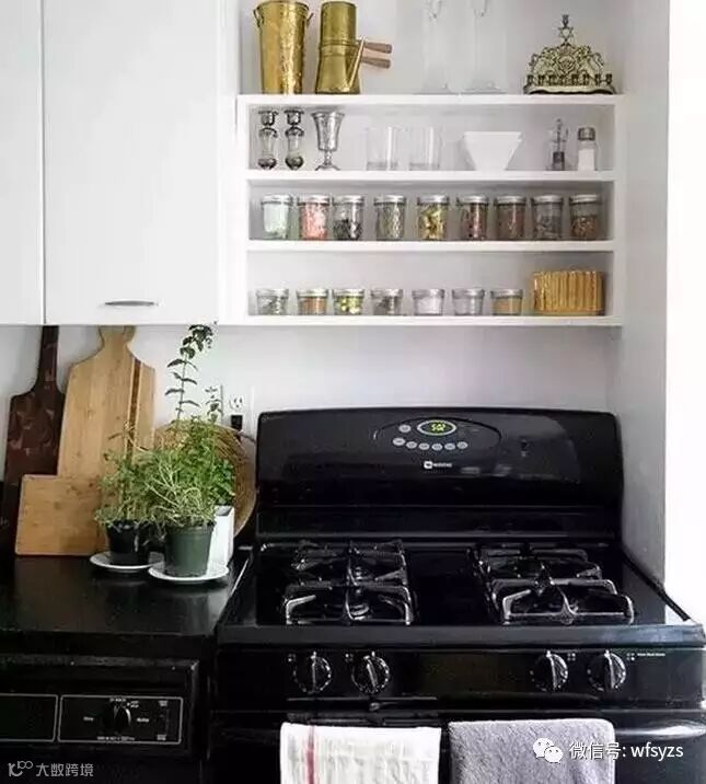 厨房以黑白两色定调,黑色的橱柜和地面让厨房看起来更加耐脏;白色的吊柜则采用了开放式和封闭式相结合的设计,不仅方便实用,精致的厨房用具也成为展示的端景。