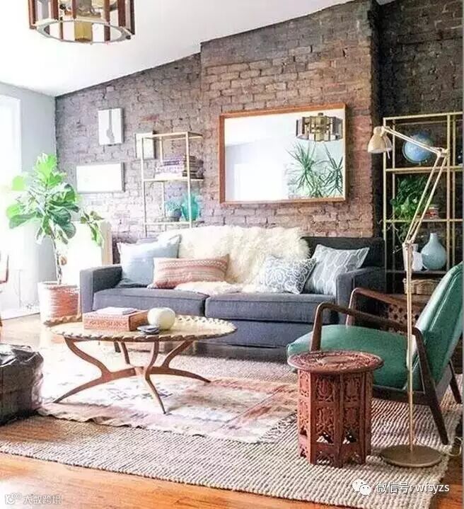 客厅沙发背景墙以红色仿古砖带出了复古的文艺气息,设计师巧妙以相近色的地板铺陈,佐以复古雕花矮凳、造型茶几和灯饰,以及红色木框镜面呼应,中间再嵌入灰色布艺沙发和绿色沙发椅、搭配棉麻质感地毯和工艺台灯,交织出复古、时尚又简约的艺术感;用木条和玻璃搭构的层架,是为空间量身定做,随意摆些饰品书籍,就很有感觉。